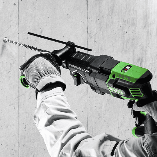 Cuenta con una empuñadura antideslizante y es conectable a un aspirador. Ofrece una capacidad máxima de perforación en hormigón de 4-28 mm, una capacidad máxima de perforación en metal de 13 mm, y una capacidad máxima de perforación en madera de 32 mm.