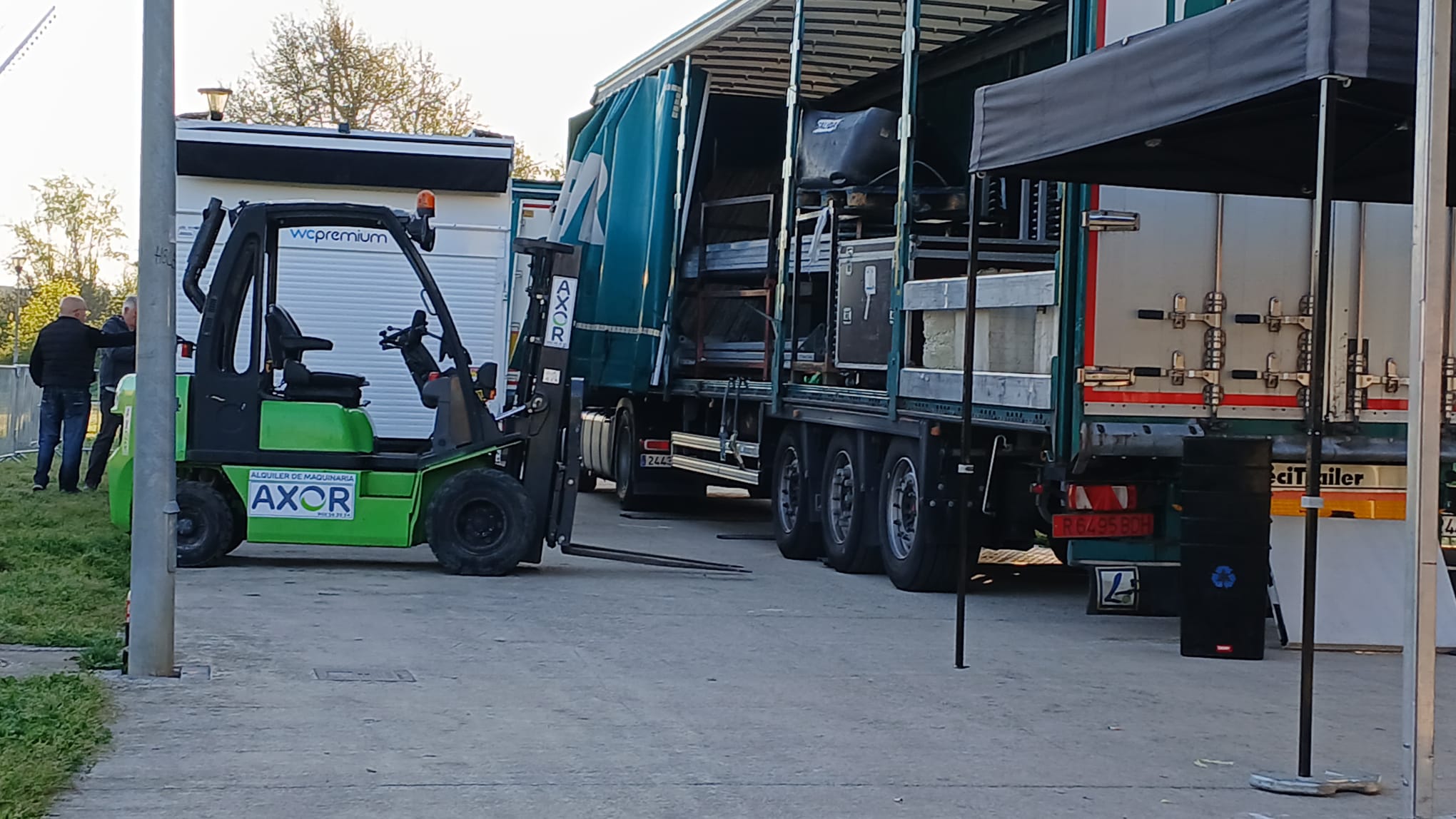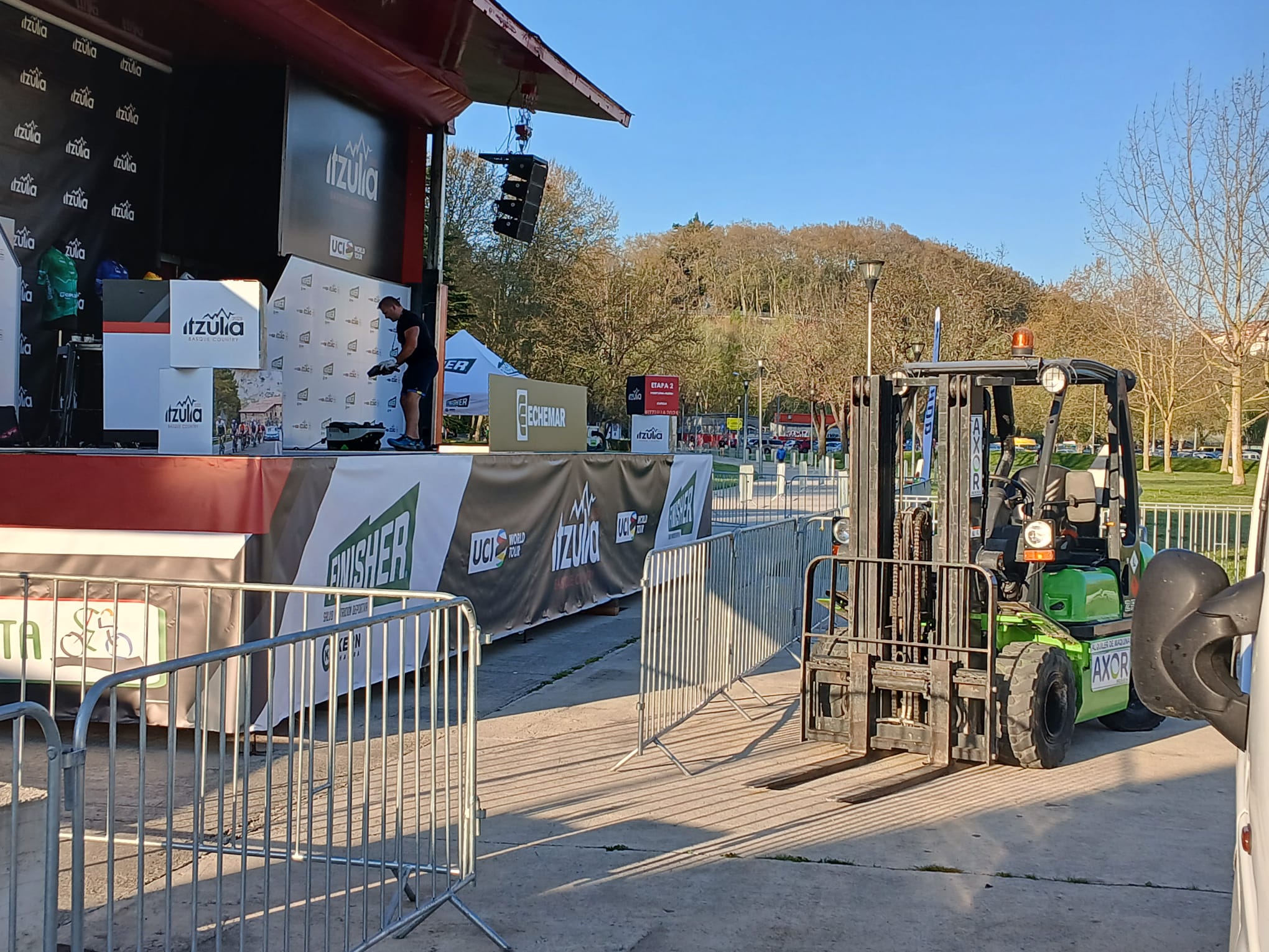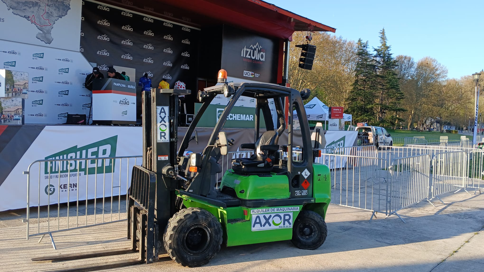Las carretillas elevadoras de las delegaciones de AXOR rentals Navarra y Álava han ayudado con los preparativos de la la Itzulia 2025 en varias de sus jornadas.