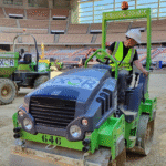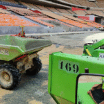 Manipuladores telescópicos, dumpers y rodillos se están encargando de que la nivelación y drenaje del terreno de juego sean óptimos. También se está trabajando ya en la implantación del césped del terreno de juego para la final.