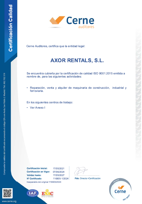 La calidad y la seguridad han sido desde siempre dos de los principales pilares que mueven a AXOR rentals. La calidad de nuestro servicio y la calidad de nuestras máquinas, la seguridad en el trabajo de nuestros/as trabajadores/as y la seguridad a la hora de emplear las máquinas y herramientas.
